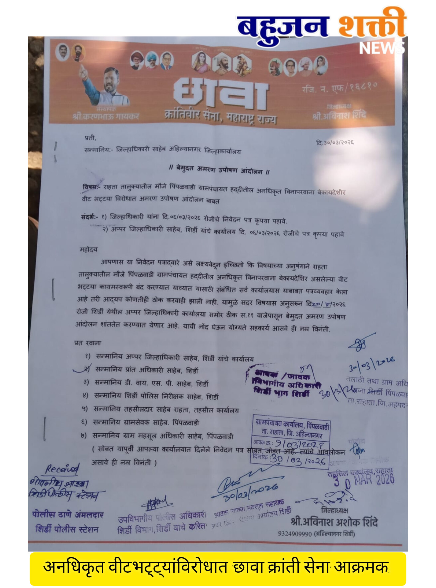 तालुक्यातील पिंपळवाडी ग्रामपंचायत हद्दीत सुरू असलेल्या अनधिकृत व विनापरवाना वीटभट्ट्यांविरोधात छावा क्रांती सेनेने आक्रमक भूमिका घेतली आहे. या बेकायदेशीर वीटभट्ट्या तात्काळ बंद न केल्यास २० एप्रिलपासून शिर्डी येथील अप्पर जिल्हाधिकारी कार्यालयासमोर बेमुदत अमरण उपोषण आंदोलन छेडण्यात येणार असल्याचा इशारा ‘छावा क्रांती सेना’ संघटनेचे अहिल्यानगर जिल्हाध्यक्ष अविनाश शिंदे यांनी दिला आहे.
