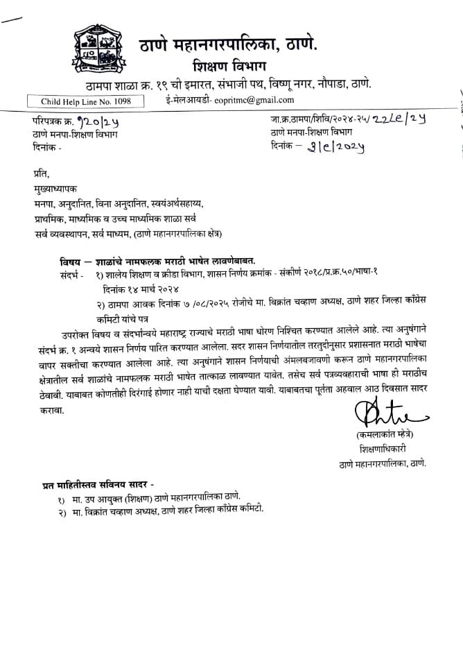 ठाणे महानगरपालिका शिक्षण विभागाने शाळांना मराठी नामफलक लावणे सक्तीचे केले असतानाच आता यावरून नवे राजकीय समीकरण तापू लागले आहे. “नामफलकापुरतेच मर्यादित नका राहू; शाळांचा सर्व व्यवहार मराठीतच व्हावा,” अशी मागणी शहर काँग्रेस कमिटीचे अध्यक्ष विक्रांत चव्हाण यांनी केली आहे.