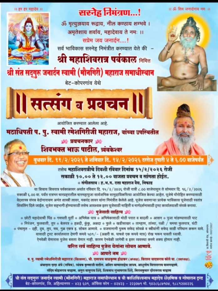 कोपरगांव तालुक्यातील श्री राष्ट्रसंत प.पु. जनार्दन स्वामी (मौनगिरी) महाराज समाधी मंदिर, कोपरगांव-बेट येथे महाशिवरात्र निमित्त दि. ११ फेब्रुवारी ते १६ फेब्रुवारी दरम्यान विविध धार्मिक कार्यक्रमांचे आयोजन करण्यात आले आहे.