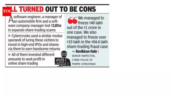 बावधन पोलिसांनी दिलेल्या माहितीनुसार, पीडितेचा सेलफोन नंबर एका मेसेजिंग ॲप्लिकेशनवर एका ग्रुपमध्ये जोडला गेला होता जेथे फसवणूक करणारे नेहमी ऑनलाइन शेअर्स ट्रेडिंग करून मिळालेल्या चांगल्या परताव्याची चर्चा करत होते. शेअर ट्रेडिंगबद्दलच्या टिप्सबद्दल ग्रुप सदस्यांनी नेहमी ग्रुप ॲडमिनचे आभार मानले.या मेसेजच्या आमिषाने पीडित तरुणीने ग्रुप ॲडमिनशी संपर्क साधला. ग्रुप ॲडमिनने त्याला ऑनलाइन शेअर्सच्या व्यापारात केलेल्या गुंतवणुकीवर 500% परतावा देण्याचे आश्वासन दिले. त्यानंतर फसवणूक करणाऱ्यांनी त्याला शेअर ट्रेडिंग ॲप्लिकेशनची लिंक पाठवली. पीडितेने ॲप्लिकेशन डाउनलोड केले.पीडितेने कमी किंमतीच्या शेअर्सचा व्यापार सुरू केला. त्यानंतर ग्रुप ॲडमिनने सॉफ्टवेअर इंजिनीअरशी संपर्क साधला आणि त्याला उच्च मूल्याचे शेअर्स आणि IPO मध्ये गुंतवणूक करण्यास सांगितले. पीडितेने ते मान्य केले. फसवणूक करणाऱ्याने त्याला उच्च मूल्याचे शेअर्स आणि आयपीओ खरेदी करण्यात मदत करण्याचे आश्वासन दिले.फसवणूक करणाऱ्याने नंतर पीडितेसोबत 6 भिन्न बँक खाती सामायिक केली आणि त्याला बँक खात्यांमध्ये पैसे हस्तांतरित करण्यास सांगितले जेणेकरून संशयित पीडितेसाठी उच्च-मूल्याचे शेअर्स खरेदी करू शकेल, पोलिसांनी सांगितले.त्यानंतर पीडितेने पैसे ट्रान्सफर केल्याचे पोलिसांनी सांगितले. अर्जाने काही दिवसांतच 1 कोटी रुपयांहून अधिक नफा दाखवला. जेव्हा पीडितेने नफ्यासाठी शेअर्स विकण्याचा निर्णय घेतला तेव्हा फसवणूक करणारे त्याला परवानगी देण्यासाठी आणखी पैसे मागत राहिले. त्यानंतर आपली फसवणूक झाल्याचे पीडितेच्या लक्षात आले.त्याचप्रमाणे, चिंचवड येथील एका ऑटोमोबाईल कंपनीच्या व्यवस्थापकाने पिंपरी-चिंचवडच्या सायबर पोलिसात तक्रार दाखल केली, की ऑनलाइन घोटाळेबाजांनी ऑनलाइन शेअर्सच्या व्यापारात केलेल्या गुंतवणुकीवर चांगला परतावा देण्याचे आमिष देऊन त्यांची 64.4 लाख रुपयांची फसवणूक केली.याशिवाय, वाकड येथील रहिवासी असलेल्या एका सॉफ्टवेअर कंपनीच्या व्यवस्थापकाने सायबर पोलिसांत तक्रार दाखल केली असून, ऑनलाइन फसवणूक करणाऱ्यांनी आपल्याला आकर्षक परताव्याच्या आमिषाने एक कोटी रुपयांची फसवणूक केली आहे.पिंपरी चिंचवडच्या सायबर पोलिस स्टेशनचे वरिष्ठ निरीक्षक रविकिरण नाळे यांनी TOI ला सांगितले, “आम्ही 1 कोटी रुपयांपैकी 40 लाख रुपये गोठवण्यात यशस्वी झालो. 64.4 लाख रुपयांच्या शेअर-ट्रेडिंग फसवणूक प्रकरणातही आम्ही 10 लाख रुपयांहून अधिक गोठवण्यात यशस्वी झालो,” नाळे म्हणाले.