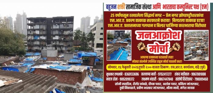 वरळीतील रखडलेल्या झोपडपट्टी पुनर्वसन प्रकल्पाविरोधात संतप्त झालेल्या रहिवाशांनी आता थेट आंदोलनाचा इशारा दिला आहे. बहुजन शक्ती आणि भारतीय कम्युनिस्ट पक्ष (मार्क्सवादी) यांच्या संयुक्त विद्यमाने सोमवार, दि. १६ फेब्रुवारी २०२६ रोजी दुपारी २ वाजता वांद्रे (पूर्व) येथील झोपडपट्टी पुनर्वसन प्राधिकरण (एसआरए) कार्यालयावर जनआक्रोश मोर्चा काढण्यात येणार आहे.